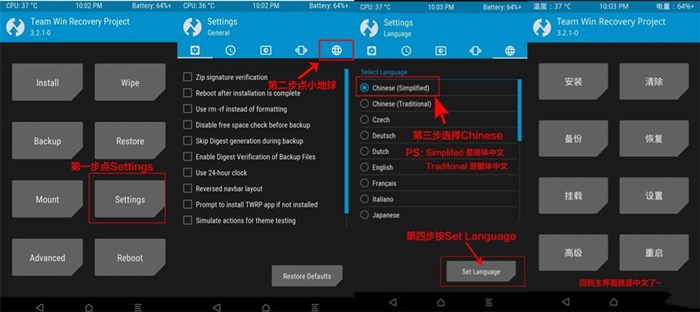下面的设置,把TWRP设置为中文显示,这样就更加方便我们刷机玩机啦TWRP界面点击