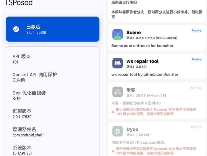 - 基于libxposedAPI100的模块已不再受支持,基于 rovo89 Xposed API 的模块不受影响