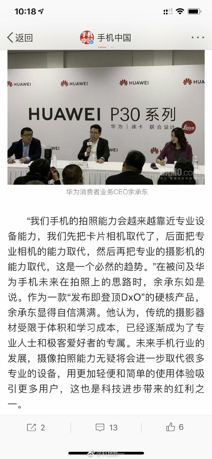 华为在上海正式发布了旗下P系列的最新机型P30和P30 Pro,会后在对余承东的采访中,对于未来华为手机在摄影方面的布局进行了深入的讨论。余承东表示,华为手机已经越来越接近专业设备,先把卡片机取代了,再取代专业相机,然后再取代专业摄影机,这是一个必然趋势!经过了近期华为真的吸引了众多的目光,先是P30 跟P30 Pro赚足了眼球,4月11日,华为P30系列手机国行版与各位用户见面,并开启同步销售。产业链透露,目前国内P30系列单日出货已超过10万,余承东更是表示华为手机今年的目标是完成2.5亿台出货量。接着又爆出火热的拍月亮事件后,这不,余承东现在又要取代专业摄影小编记得他曾经说过华为最难超越的就是自己,看来华为对自己是充满自信的,大家认为华为手机会取代专业摄影设备吗?