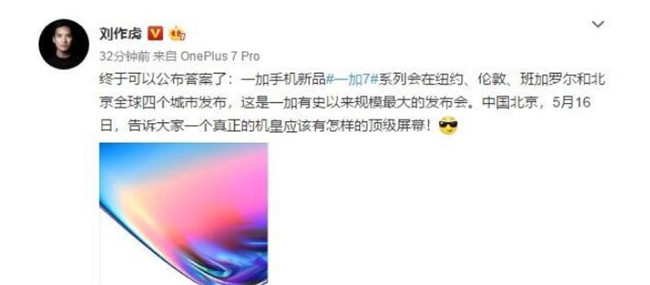 4月23日,一加科技刘作虎正式官宣,确认将于5月16日在北京正式发布一加7系