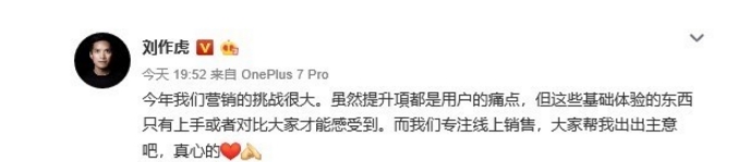 一加科技CEO刘作虎发布微博称:“今年我们营销的挑战很大。虽然提升项都是用户的痛点,但这些基础体验的东西只有上手或者对比大家才能感受到。而我们专注线上销