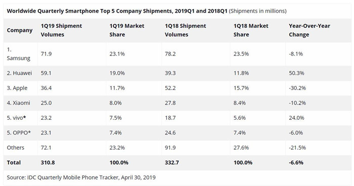 2019年第一季度,苹果环比大跌30%市场份额,虽说从1月份就降价了,貌似大家不太感冒。]iPhone大降价也无济于事,因为还是太贵了,今年第一季度苹果又被华为反超了,算上荣耀再次位居全球第二,预备中,估计很快来了。具体数据如下:OV属于正常波动,小米下跌10.2%。others更惨,前6家厂商占据了76.8%的市场份额,留给其它品牌的市场仅剩23.2%(销量同比大降21.5%)。这个趋势肯定会继续下去,不管在中国还是全球。无疑,手机市场是残酷的,且竞争愈来愈激烈。国产手机的战场已经从国内开始向全球蔓延,在2019年荣耀(华为)和Redmi(小米)品牌的独立以及oppo,vivo将会带领一众国产手机制造商走向全球。国产手机在一步步强大,走向世界。这是我们国人所乐于见到的,在竞争激烈的智能手机时代,希望他们越走越远吧。