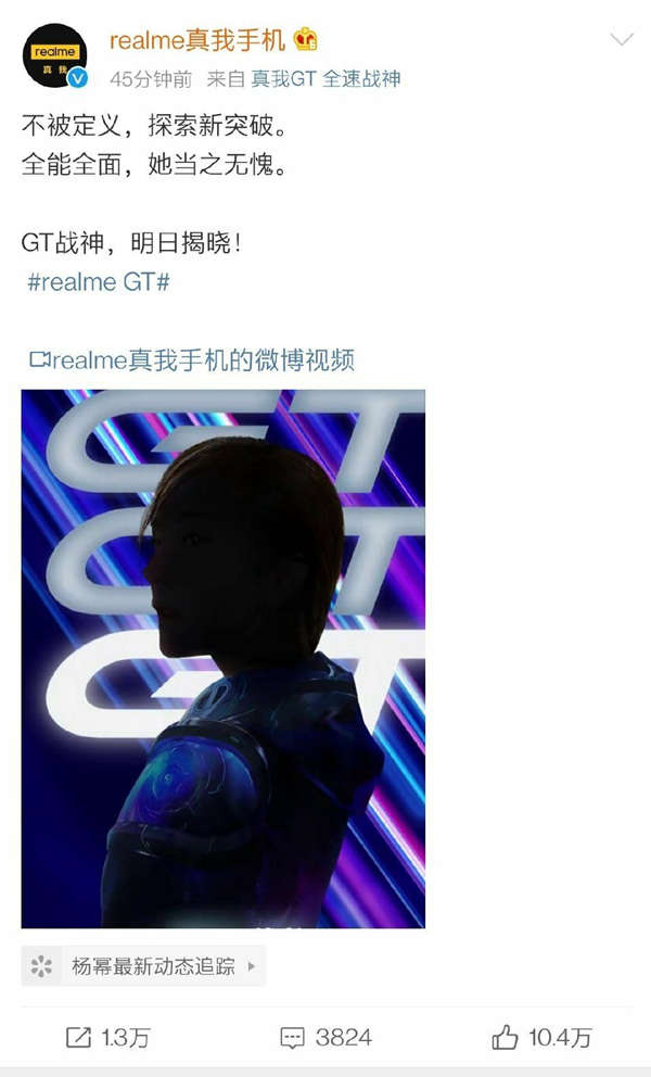 今天Realme也终于官宣了:杨幂成为realme真我全球品牌代言人。并且放出了相关的海报,海报中杨幂手持realme真我GT海报已发布,两侧犹如机甲羽翼一样的蓝色纹理,在光影折射下呈现出非常精致而冷酷的战斗感!素皮版的应该会更有特色,而配置上将搭载高通骁龙888处理器,UFS3.1,「满血版」