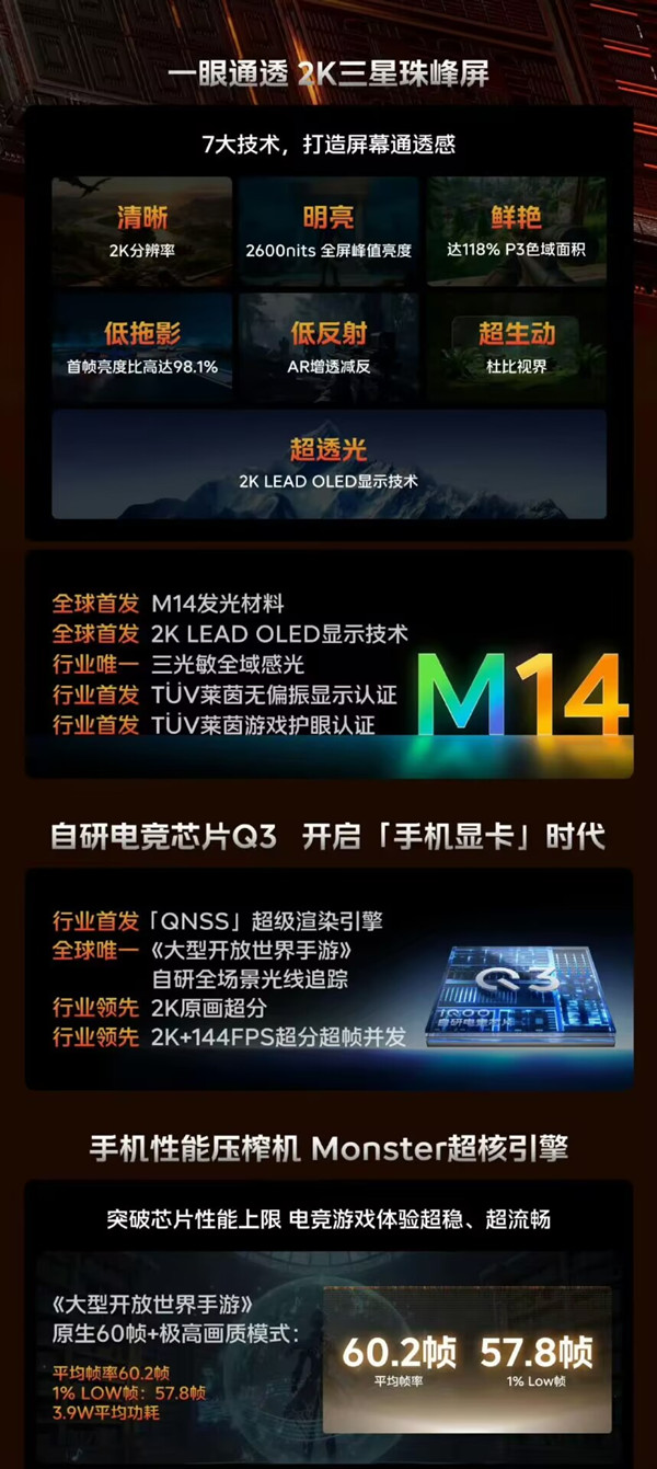 据悉iQOO15屏幕,搭载三星显示2K LEAD OLED 创新技术,M14发光材料,2K三星珠峰屏,实现一眼通透;芯片,首批搭载第五代骁龙8至尊版,骁龙调校看iQOO」真不是盖的,自研电竞芯片Q3支持「全场景光追、超分、超帧」,游戏体验顶级!综合体验上,首添潜望长焦,有 7000mAh 电池 + 120W 有线闪充 + 50W 无线快充,还有新 X 轴马达、立体声双扬等。