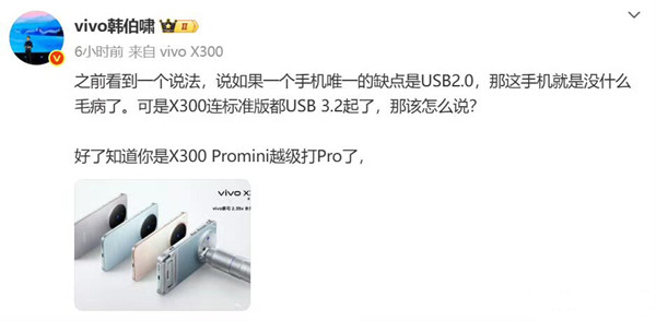 韩伯啸表示,他之前看到过一个说法:“如果一个手机唯一的缺点是 USB 2.0,那这手机就是没什么毛病了”,可是 X300 系列手机连标准版都已经配备 USB 3.2 接口了,还将 X300 系列称为“越级打 Pro”,并就上面的问题反问:“那该怎么说?”。更多手机教程请持续关注ROM乐园官网,文章来自www.romleyuan.com