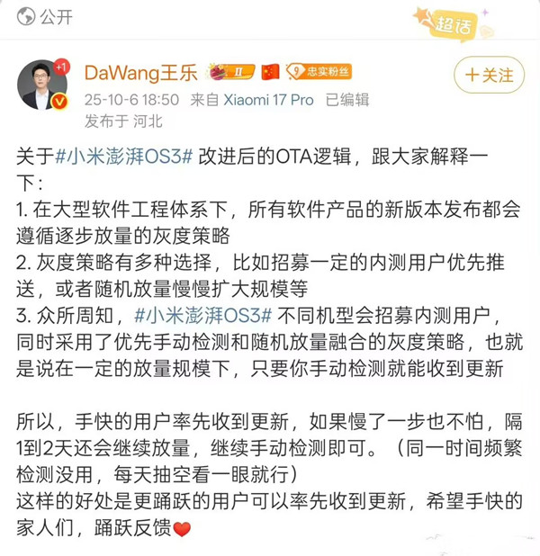 此外小米公司应用软件部总监王乐关于小米澎湃OS3改进后的OTA逻辑,做出了如下解释: