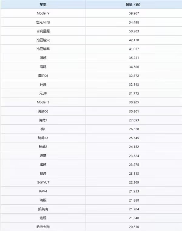 2025年9月全国乘用车市场销量榜单正式揭晓,特斯拉Model Y以59907辆的批发销量再度登顶,成为当月销量最高的车型。位列Model Y之后的是宏光MINI(54498辆)与吉利星愿(50203辆),