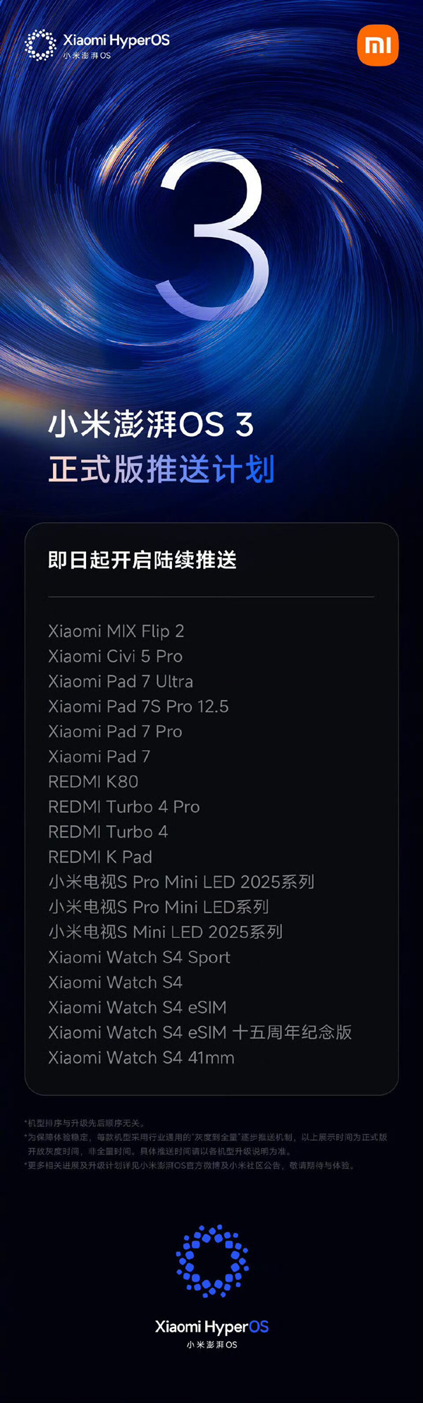 以下机型即日起开启小米澎湃OS 3正式版推送,K80、Turbo 4 和 Turbo 4 Pro 即日起开始陆续推送,看看有没有你的?用户可通过「设置」-「我的设备」- 无缝升级至小米澎湃OS 3 正式版。