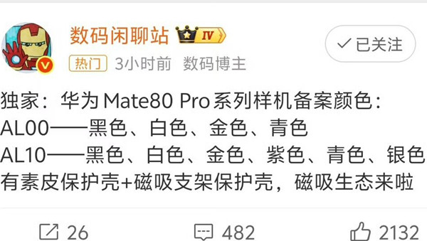 华为Mate80系列备案的颜色特别多,从爆料来看都是比较经典的配色了,不知道今年的这一代Mate,又会有什么新的玩法?至于颜值,你永远可以相信华为Mate!