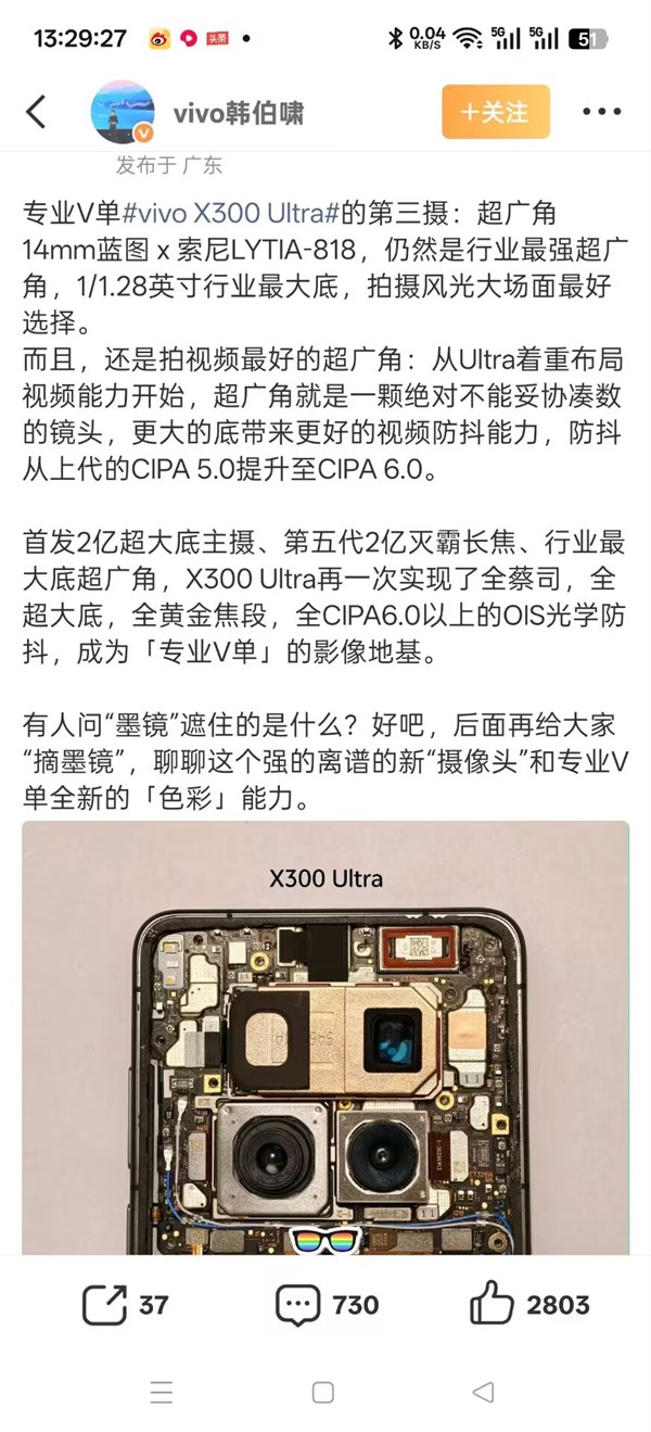 vivo韩伯啸 终于晒出影像“V单”vivo X300 Ultra的内部结构堆叠图了发文如下:
