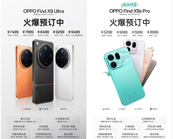 Find X9s Pro:6.32英寸小屏,天玑9500,哈苏双2亿像素(主摄+长焦都是2亿),7025mAh电池,80W有线+50W无线,IP69防水。5299起,顶配6999。