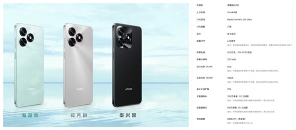 荣耀现已在其商城上架畅玩70C手机,该机搭载联发科Helio G81 Ultra处理器,可选4/6GB RAM,定价为799元起。
