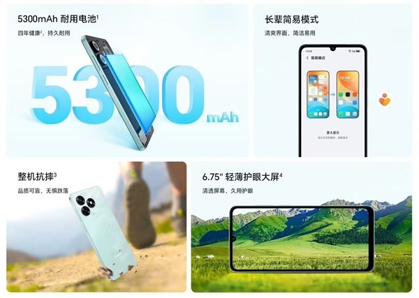 该机可选墨岩黑、揽月银、海湖青三种配色,整体厚度7.89mm,重量186g,手机正面配备一块720x1600分辨率90Hz IPS LCD水滴屏,匹配 5MP 自拍摄像头。手机背面虽然看似采用三摄造型设计,但仅具备13MP主摄。