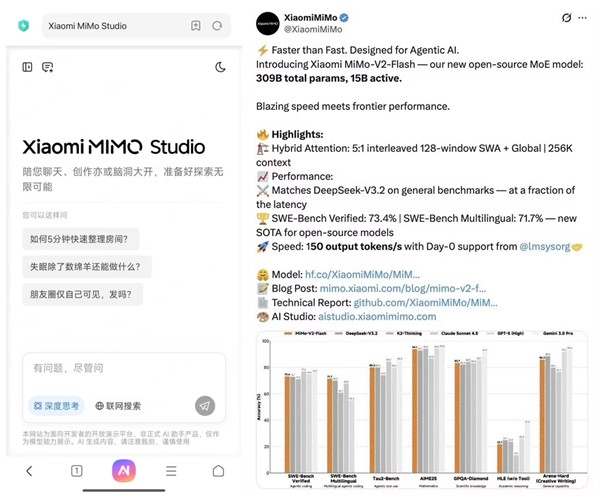 小米正式发布并开源新模型 MiMo-V2-Flash。在小米“人车家全生态”合作伙伴大会上,Xiaomi MiMO大模型负责人罗福莉加入小米后首秀并发表小米MIMO主题演讲。