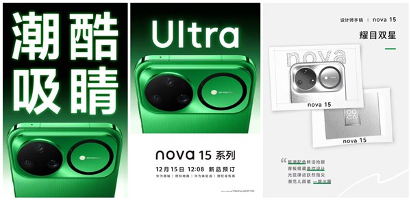 华为发布nova 15系列预订海报,海报中主打色绿色极具视觉冲击力,横向立体双圆镜头模组构建起全新设计语言,打破传统竖向设计的范式,大大提升了辨识度。