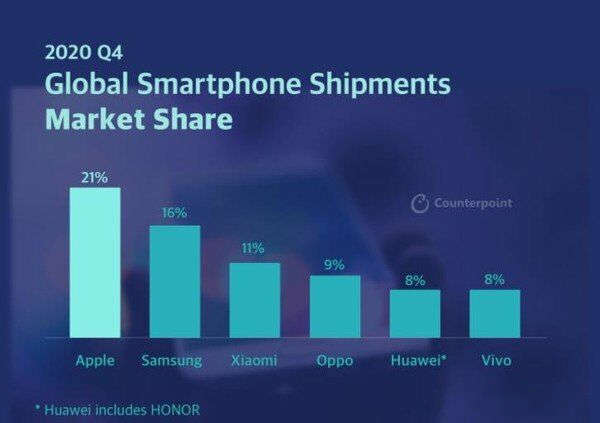 根据报告,在2020年第四季度的亚洲智能机市场,vivo和苹果的市场占有率并列第一, 市场份额达到15%,前五名有四款是中国品牌,分别是vivo,xiaomi,OPPO,HUAWEI (其中华为包含了荣耀手机)。