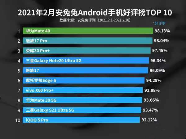 前十的好评榜单情况就是如上了,华为Mate40夺冠,魅族11Pro与荣耀30Pro+进入前三。华为Mate40Pro的综合表现真的很稳,既有麒麟9000的加持也有参数的堆积。比如徕卡影像、EMUI 11等众多优异表现.