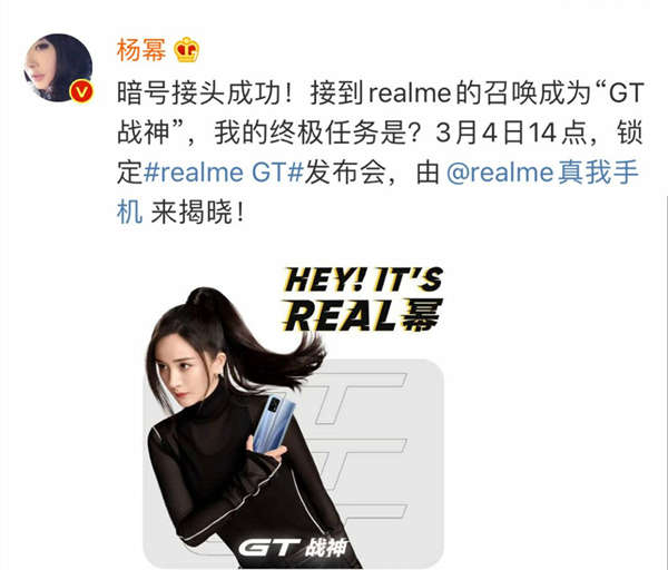 今天Realme也终于官宣了:杨幂成为realme真我全球品牌代言人。并且放出了相关的海报,海报中杨幂手持realme真我GT海报已发布,两侧犹如机甲羽翼一样的蓝色纹理,在光影折射下呈现出非常精致而冷酷的战斗感!