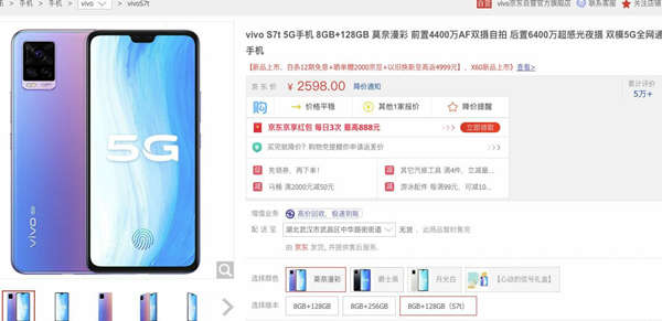 VIVO手机的价格我一直认为相对小米来说性价比不是特别高,这一次vivo S7t提供8+128GB版本,售价2598元,支持12期免息活动。 作为第二款联发科天玑820芯片机型,对比下同款芯片的Redmi 10X的6+128GB版本,目前官网售价1399元.