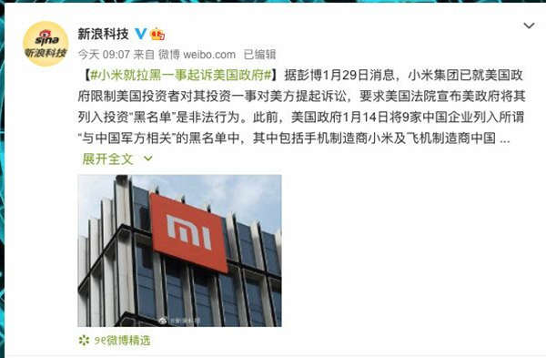 1月29日消息,小米集团已就美国政府限制美国投资者对其投资一事对美方提起诉讼,要求美国法院宣布美政府将其列入投资“黑名单”是非法行为。对于小米的这一行为很多国人为其点赞