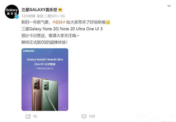 1月27日三星GALAXY盖乐世官方微博宣布,国行三星Galaxy Note 20和Note 20 Ultra两款机型已正式推送基于安卓11打造的One UI 3正式版。此次的One UI 3升级计划覆盖多种机 型数十款设备,升级周期持续至今年9月。