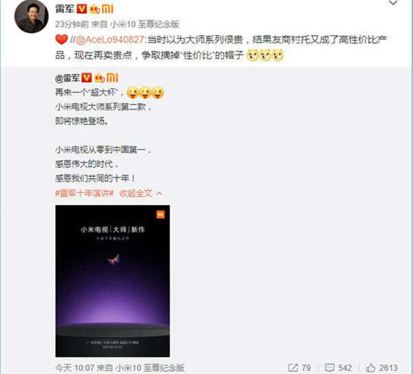 除了此前我们说过的两款手机小米10至尊纪念版和Redmi K30至尊纪念版之外,小米于8月7日再次公布第三款十周年超大杯产品-小米电视大师系列第二款来了。