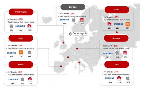 中国企业在欧洲占有35%的市场份额,OPPO和Xiaomi等新进入者分别同比增长41%和55%,华为同比下降46%,小米增长速度最快 华为在欧洲的份额在持续下滑