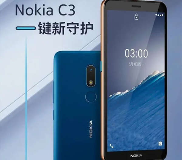 诺基亚C3外观上采用了对称式全面屏设计,但由于产品定位的原因,机身顶部边框与底部边框都略宽。而在机身左侧设置有一枚“随心键”,机身背部中轴线上方所安置的是竖排后置单摄模组,指纹识别模块则位于摄影模组下方。