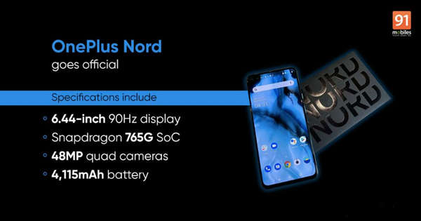 一加 Nord搭载了骁龙765G移动平台, 最高12GB运存,90Hz1080P的OLED屏幕4115mAh电池,30W的WarpCharge闪充。有天青色和灰色两种颜色。