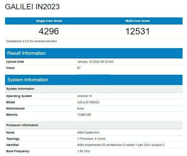 疑似一加8系列的跑分信息出现在了国外著名跨平台CPU测试软件Geekbench的数据统计网站中,性能惊人。从GeekBench 4的记录信息可以看到,这款型号为GALILEI IN2023的设备得到了单核4296分,多核12531分的成绩