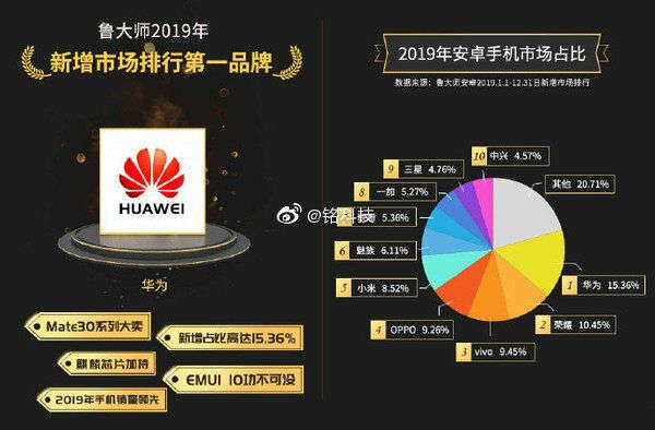 在鲁大师发布的2019年安卓手机新增市场报告中,华为以15.36%的新增市场份额排名第一,荣耀以10.45%的占比排名第二,两者加起来的新增市场份额达到25%,占了整个市场的四分之一,相当强悍。