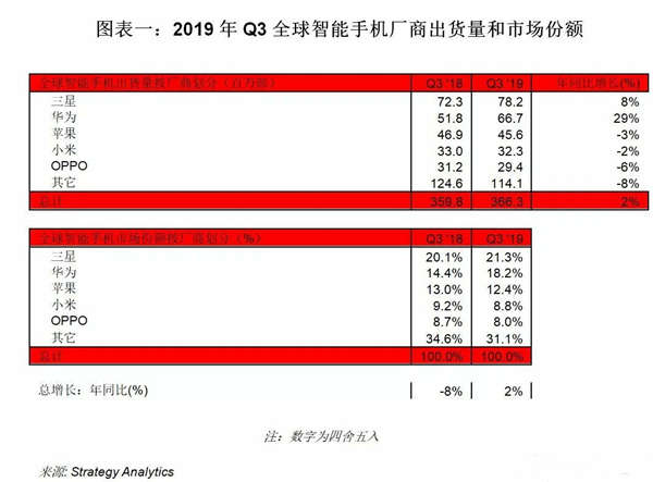 统计机构Strategy Analytics (SA) 发布了对三季度全球智能手机出货量的统计。报告显示,当季,全球智能机累计出货3.66亿台,同比增长2%。