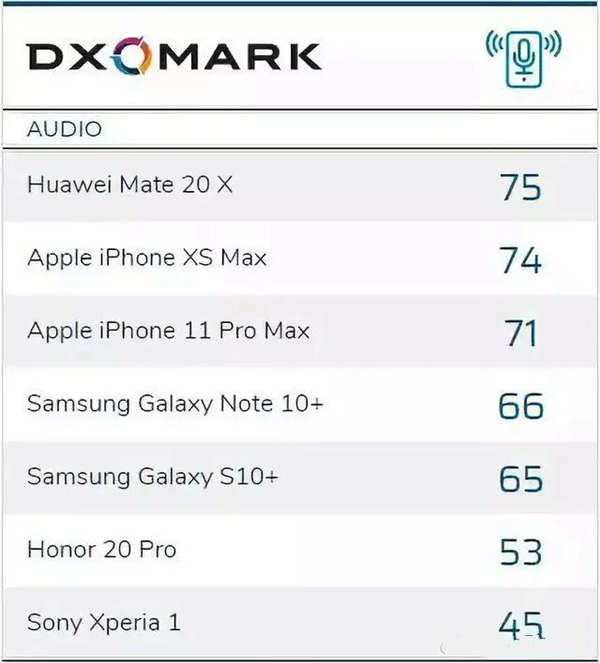DXOMARK大一直致力于专业相机及智能手机摄像头评测的,继手机拍照和视频评分后,又推出了一个手机音频评分系统.华为Mate 20X 综合 75 分夺得第一