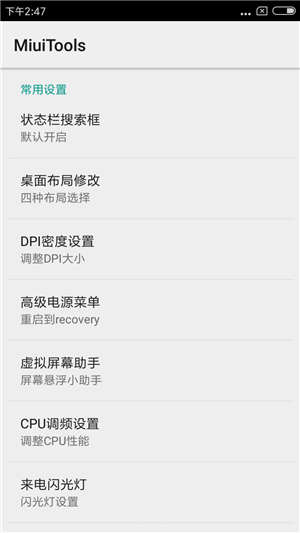基于官方MIUI9.2稳定版本 完美保留系统完整性,优化待机 多项优化,支持官方新增N多特色 UI增强,美观大气,系统轻快 桌面进行重新排布,刷完十分清爽 融合之前版本全部特色,完美 MIUI-自带APPS升级到官方最新 适合追求稳定,不经常刷机的用户 破解MIUI主题,无需登录下载 破解MIUI限制,卸载软件不卡开机 破解系统默认加密,解密system 破解系统签名,更好安装第三方软件 加入杜比顶级音效,开机即用 加入授权为SuperSU授权,纯净 加入系统级别高级电源管理 加入桌面天气农历双显示模式 加入Busybox指令集多种支持 加入自编译MiuiTools高级设置 支持桌面布局自切换功能 支持4X5,4X6,5x5,5X6切换 支持状态栏搜索框自定义开关 支持DPI数值自定义大小 首次使用,需给予Miuitools Root权限 请勿将数值设置的过大或过小 支持高级电源菜单管理 支持快速开机重启功能 支持一键重启到recovery 加入中兴屏幕助手 Lollipop风格版本 支持开启和关闭,长按高级电源菜单 加入全新CPU调频管理,多设置模式 加入USB挂载功能 挂载MTP等模式 加入来电闪关灯,默认开启 优化待机能力,更加持久给力 优化内存中用,极致超大RAM 优化手机射频,降低手机电量耗损 优化流畅性,全网最佳定制系统