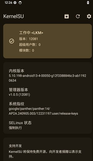 KernelSU作为首款真正意义的内核root管理器,让很多5.1内核以上的设备,成功实现了高阶root功能; 在不被软件检测的情况下,安全的在设备上运行root权限,并且支持内核编译功能,向下兼容到4.X内核手机; 下面是我们整理的KernelSU管理器,通过安装实现root权限,也可以查看当前内核版本,判断是否支持; 依旧提供两种模式选择,支持GKI模式,修改boot分区,支持LKM模式,维补boot/init生成效果 KernelSU内核管理器V1.0.5_12081特色功能 1、KernelSU_V1.0.5_12081更新发布,修复BUG 2、兼容更多设备,并且运行稳定,真正内核级别root权限 3、完整的授权ROOT权限,可对任何APP进行黑名单授权 4、深层次躲避ROOT检测,可实现银行/安全/支付等APP运行 5、支持不同品牌手机,如小米三星联想一加华为等可解锁BL设备 6、由ROM乐园官方发布,感谢大家对ROM乐园的支持,完全免费下载 7、因为机型或者BL解锁等影响,如自行不会操作的,可联系ROM乐园官方 8、KernelSU内核图片仅供参考,不同版本存在差异,以实际资料为主 9、提供完整的APK直接安装版,仅支持GKI机型+自编译内核 10、推荐稳定兼容安卓版本:安卓10-安卓16内核5.1-6.6设备 默认写默认为LKM模式,如需GKI版本的内核root,请刷写AIK3补丁 更新日志: ci: Update llvm version for chrome arcvm kernel build (#2551) 已经有root的用户,自行下载KernelSU版本的安装包,直接安装到你的手机上,选择直接安装(推荐)按钮升级到新版 未ROOT的用户,请维补init-boot分区后,生成kernel_root文件,使用ROM乐园ADB工具箱刷入到手机即可获取root权限,参照下面命令 fastboot flash init_boot magisk_root.img & fastboot reboot ROM乐园ADB工具箱下载:http://www.romleyuan.com/lec/read?id=1107