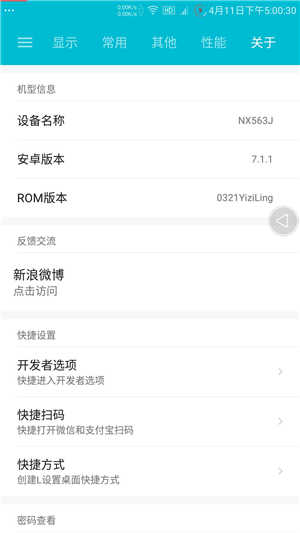 刷机需知 •务必刷入一款适合自己手机的TWRP—Recovery才可以刷机 •部分机型需进行格式化data分区(清除-格式化DATA分区-输入yes-确定) •格式化data会清除内置储存,格式化前记得备份好数据! •如果刷机指纹不能用,请检查刷机步骤是否双清,多次测试正常 •由于很多原因,论坛D大C大不再更新,后续我会维护 感谢D大等多位大神在制作过程中给予的帮助 基于上一版本修复制作0412版本 修复L设置短信闪光灯开启不可用 修复L设置按钮打开延迟问题 修复L设置其他页面残余BUG 加入黑域补丁版,开机自带 加入微博反馈,更简单解决问题 上一版可直接刷入,可不双清 Nubia自带全部特征,适度精简 深度优化系统残留沉淀,lib apk 完美使用SuperSU授权管理 自动签名boot,操作简便 破解系统限制,自定义精简程序 添加自编译高级设置-感谢D大指导 ★支持状态栏时间显秒设置 ★支持状态栏时间细化风格 ★支持状态栏显示星期和日期 ★支持状态栏锁屏下拉农历 ★状态栏添加锁屏文字自定义 ★状态栏添加上下运营商自定义 ★状态栏支持双排网速显示,带箭头 ★状态栏线性电池显示,带充电动画 ★状态栏支持电量文字隐藏或设置 ★添加悬浮助手,多模式可设置 ★添加滑动状态栏亮度调节,可开关 ★添加侧边栏开关,免VIP开启门槛 ★添加网络悬浮窗,样式透明自定义 ★添加摇晃自定义-10多种摇晃设置 ★添加双击自定义-10多种双击设置 ★添加来电闪光灯设置,多种模式 ★添加自定义电池图标,多图标可设置 ★添加编译版屏幕助手,支持自定义 ★添加虚拟按键,支持开关等设置 ★添加双击home锁屏,可设置开关 ★添加护眼模式,屏幕圆角设置 ★添加通知特效,无VIP开启门槛 ★添加屏幕密度DPI自定义设置功能 ★添加性能模式,支持多种省电运行模式 ★添加WIFI密码查看等一些常用设置 ★还有很多内容,未一一介绍...... 屏蔽部分系统界面启动广告 省电逻辑分级优化,更久待机 适度精简,保持特色,大内存 优化流畅度提升,达到长期使用的效果 更多功能,可自行体验,后续会不断开发